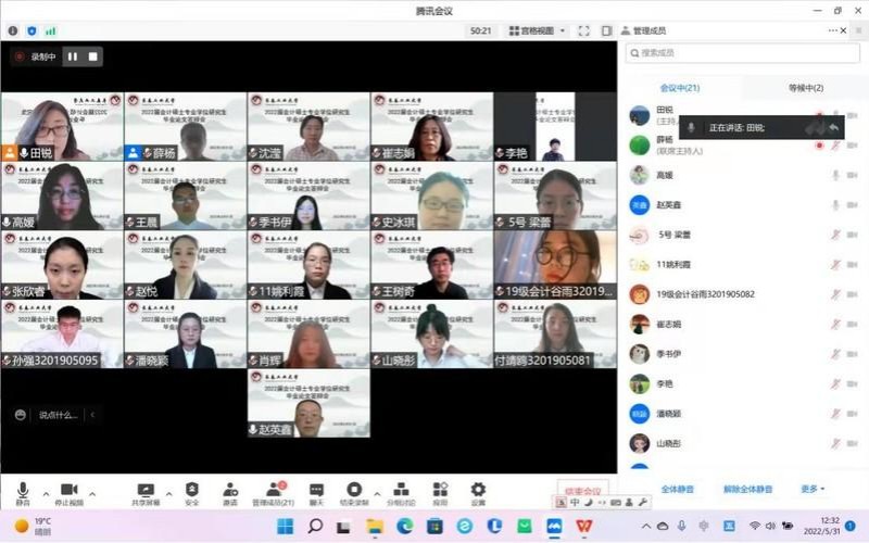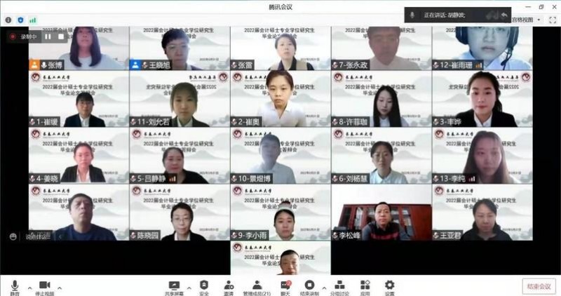 2022年5月31日下午12点30分,永利官网MPAcc教育中心根据学校研究生院研究生培养工作的总体安排和部署,组织了2022届MPAcc硕士毕业答辩。本次毕业答辩采用了腾讯会议线上答辩的方式,下设了4个答辩小组,共涉及54名学生。其中19级会计专硕52人,18级会计专硕2人。答辩过程全程记录,同时低年级同学也可进入会议进行观摩学习。