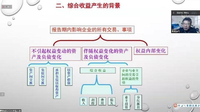 杨教授首先介绍了综合收益相关的概念以及综合收益产生的背景,即综合收益是指在会计期间除所有人投资和所有人派得以外的全部所有者权益变动。又结合实例围绕会计报告相关信息为研究生同学介绍了报告期内影响企业的所有交易、事项中伴随权益变化的资产及负债变化,综合收益正是其中关机一环,同时还介绍了综合收益在会计准则不断完善的过程中逐渐得到重视。紧接着杨教授介绍了报表之间的关系,通过对资产负债表的解析,以此引出综合收益包括净利润和其他综合收益,重申了其确认的重要性。随后,杨教授与屏幕面前的研究生同学分享了“几点疑惑”,包括为什么要列报综合收益以及为什么综合收益由收入、费用、利得、损失四要素构成,但计量方式不同?等几个疑问。虽然这些问题在如今的会计学届得到了解答,但是却是杨教授当年在求学路上琢磨不透的种种疑惑,这是一种新老学者在求学经历上的差别与碰撞,杨教授也坦言希望如今的大学研究生能更加努力探索,始终保持求知欲和钻研精神。