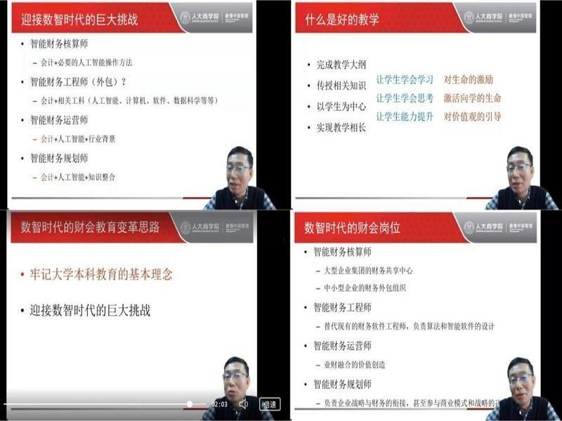 然后,中国人民大学博士生导师王化成教授就智能化时代的人才培养发表了自己的看法。他主要深入讲解了以下三个方面的内容:数智经济及其在我国的发展、数智时代的财会创新与岗位变化以及数智时代的财会教育变革思路。他认为虽然未来充满了不确定性,但是科学技术的发展为我们提供了无限可能,预测未来最好的方法就是创造未来。