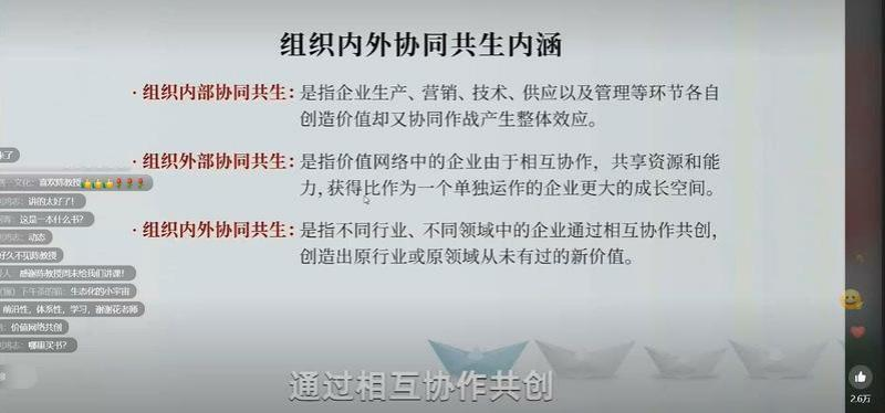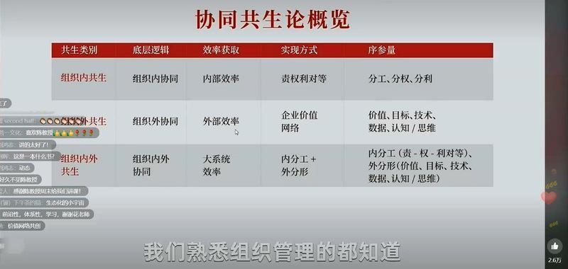 陈方崴:在今天的直播中,陈教授一直在强调“协同共生”,除了组织内共生和组织外共生,组织内外也要共生。在充满变数的大数据信息时代,寻求稳定有序无变动的组织已成为奢望,这时就需要组织内部及各组织之间共同协作,打破技术孤岛,实现共生共赢。