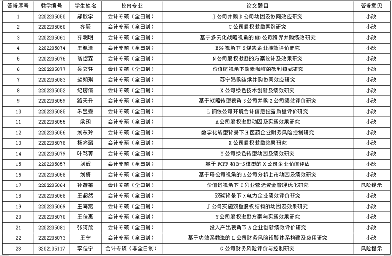 此次预答辩应参加人数为45人,实参加45人,全部通过预答辩。其中3名同学论文给与风险提示,需重点修改完善。详细情况如下: