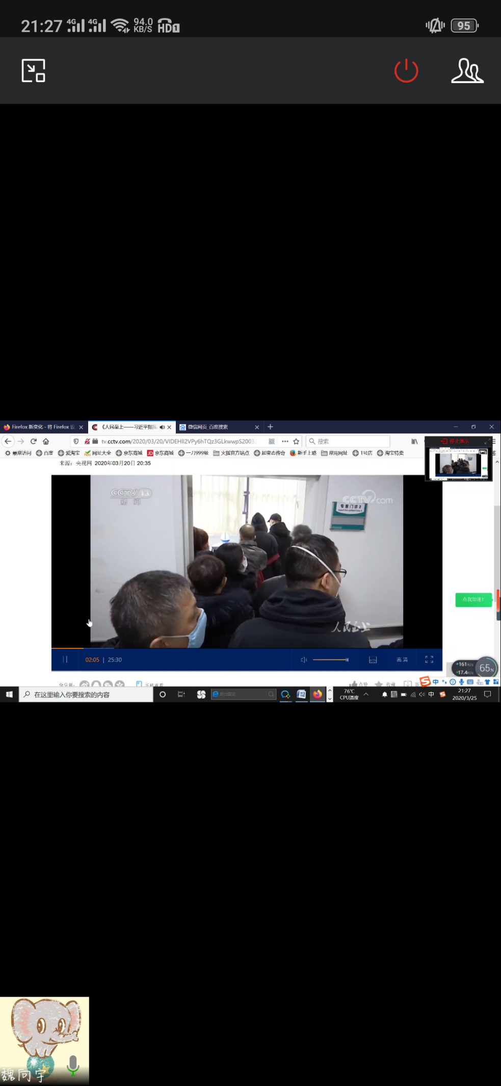 首先全体党员一起学习观看CCTV记录片《人民至上—习近平指挥战“疫”进行时》。党的根本宗旨是全心全意为人民服务,“人民至上”是共产党人奋斗的准则,一切为了人民,以人民为师,与人民同行。在本次抗疫期间,在以习近平同志为核心的党中央的领导下坚定“人民生命安全,健康第一位”的总则,全国人民团结一心,共克时艰,取得了抗击疫情的阶段性胜利。