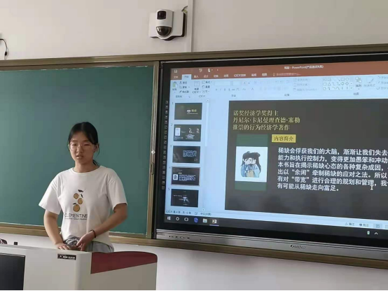 第三位上台分享的同学是190502班的钱明月,她主讲了本书主旨:稀缺心态的各种复杂成因,提出以“余闲”牵制稀缺的应对之法,对“带宽”进行合理规划和管理,我们才有可能从稀缺走向富足。