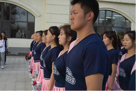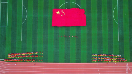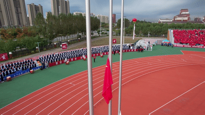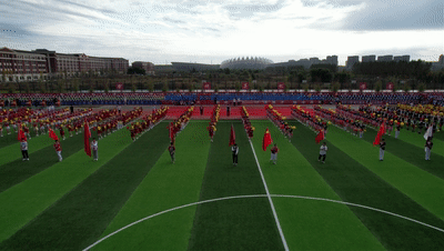 升旗结束后,开场舞表演人员为全场师生带来了充满活力的舞蹈整齐划一的舞蹈为整个操场染上了一层靓丽的红色,鲜艳的红旗不断地变换着形状,从人字形,到圆圈,再到麦浪,整个过程精彩纷呈。