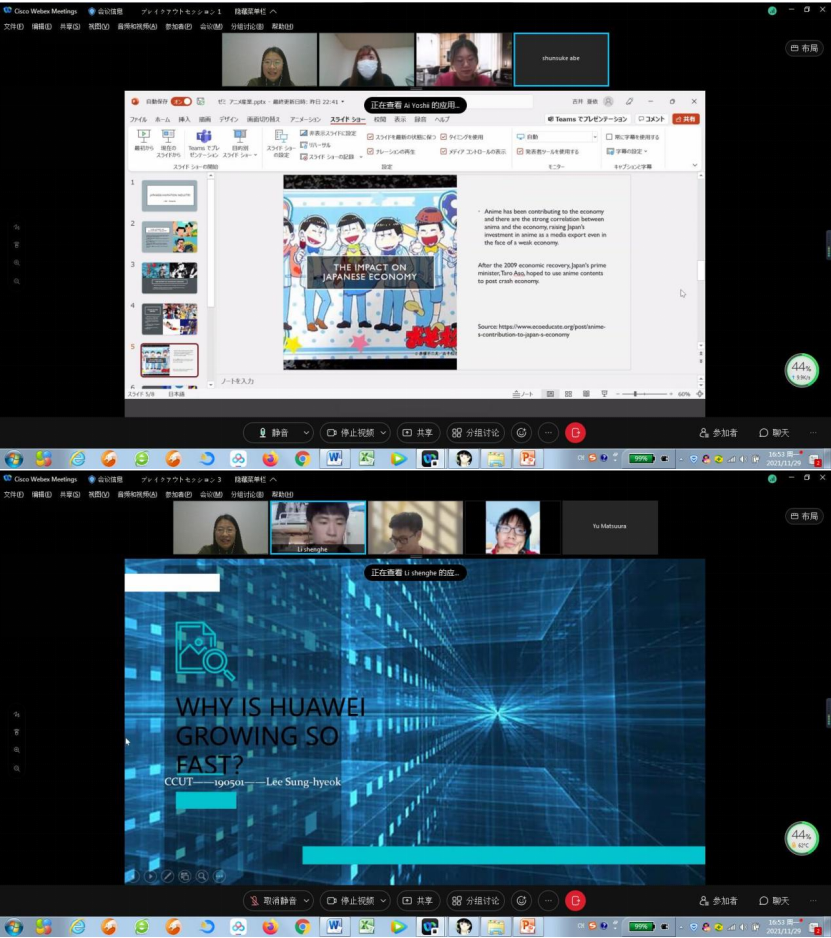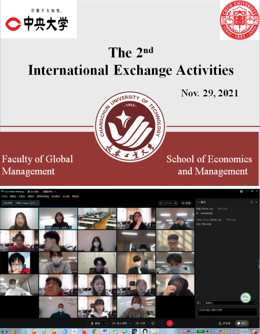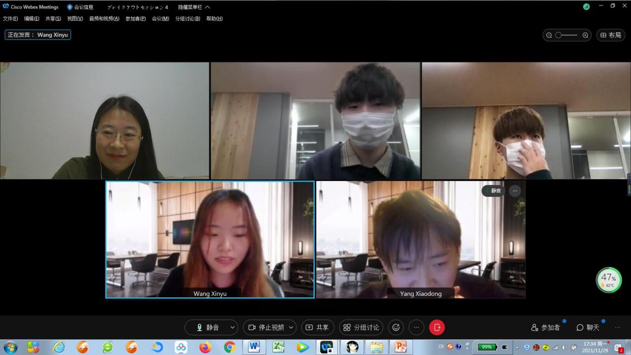 以2020年12月至2021年1月成功举办首届本科生国际交流活动为良好基础,经济系高鹤老师与日本中央大学经济学部和国际经营学部两位合作老师再次进行多次协调磋商,经过前期近两个月的充分准备,开启了第二轮本科生国际交流活动。2021年11月29日下午4点,高老师带领的2019级国贸专业学生团队和部分2020级学生与国际经营学部杨老师指导的研讨小组在Webex平台上如期相聚。