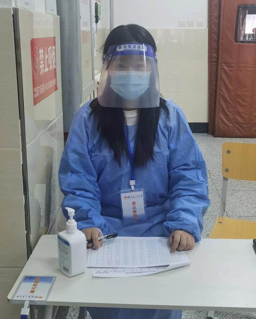190504班邵楚涵是校团委志愿者工作中心的工作人员,在疫情期间主动报名了学院的校园志愿者。3月11日上午在食堂入口维持秩序,提醒测温,监督佩戴口罩情况,简单吃过午饭后,下午她又马不停蹄赶往体育馆内辅助医护工作者核算采样和登记。接下来的三天里,她重复着相同的工作,却依然热情不减。后来又积极参与到寝室出入登记的工作中。疫情面前没有旁观者,在这场没有硝烟的战役中,青年学子们用爱和力量,谱写着最美的篇章。