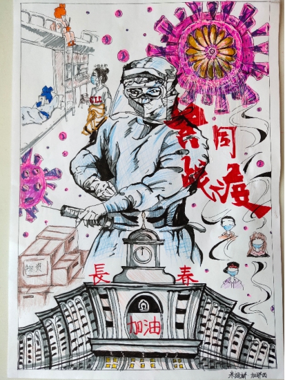 在抗疫过程中,同学们通过各种各样的形式记录学习与生活中的点点滴滴,表达着抗击疫情的精神和对未来生活的期待。190509班的班导师会议中,同学们通过歌曲演唱、音乐弹奏、心得分享、集体舞蹈等才艺表演,彼此间相互鼓励、共同期待未来,以会议为纽带传递友情与祝福。20级同学们用纸笔书写抗疫勇气、用书画表达必胜信念,向坚守岗位、奋战一线的医务人员、防疫工作者表达敬意,感恩抗疫英雄和人间温暖,以画传情、“艺”起抗疫。200510班孙嘉骏、200511班杨明昊与200514班聂小普同学一起作为导演联合制作了抗疫短视频,记录了同学们在抗疫过程中学习与生活的各种细节,通过志愿者活动、学生在线听课、学生课余生活等情节表达了同学们抗击疫情的决心、行动和对疫情之后生活的期望。