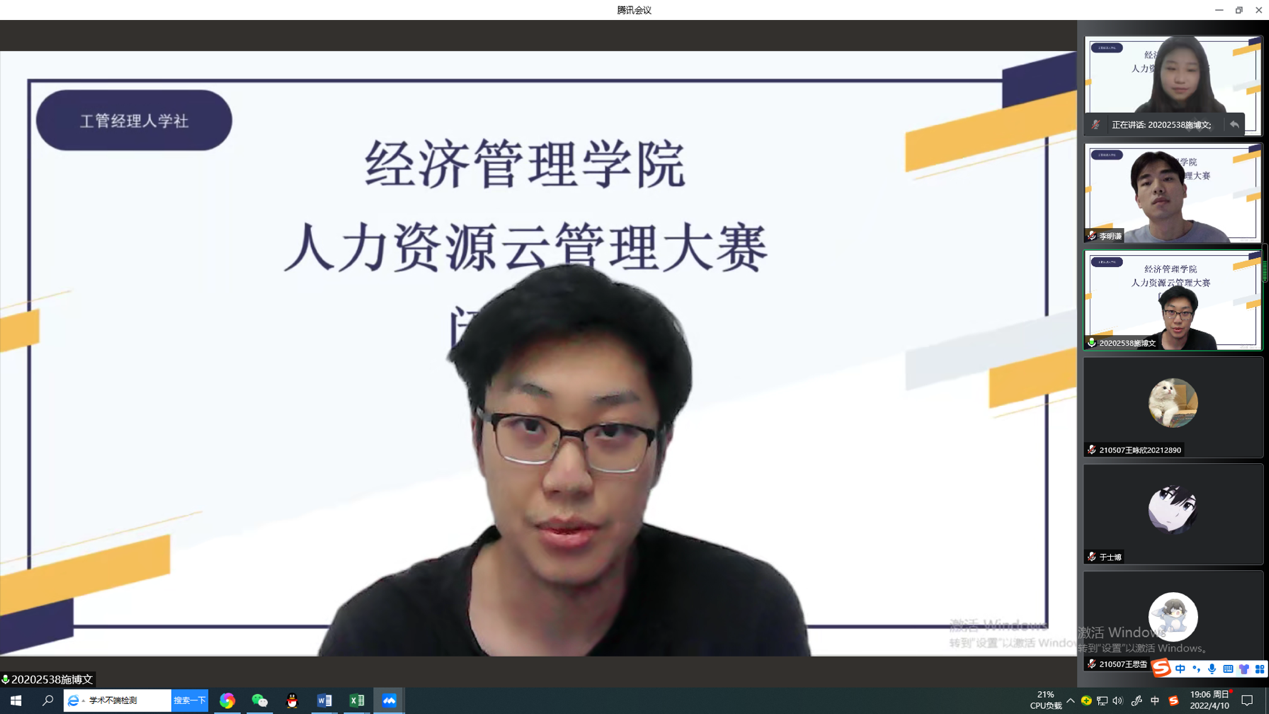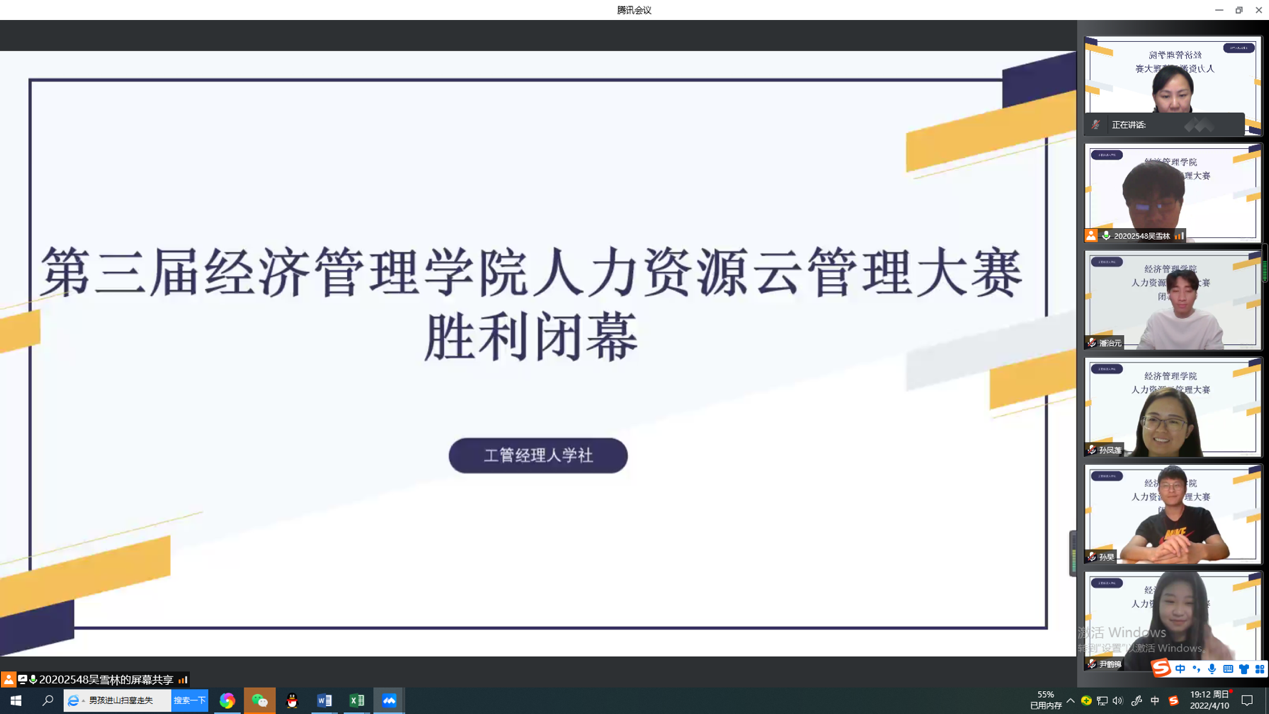 2022年4月9日-10日,工商管理系工管经理人学社组织的yl23455永利集团“第三届人力资源云管理大赛”总决赛顺利完成,10日晚19:00,大赛闭幕式成功举办,大赛圆满收官。工商管理系主任王亚君老师、工商管理系党支部书记孙凤莲老师、工管经理人学社社长孙昊、工管经理人学社秘书长潘治元、组织相关赛事工作的工管经理人学社副社长吴雪林、技术部部长李明谦,以及参赛的二十三支队伍的同学们出席了本次大赛闭幕式。