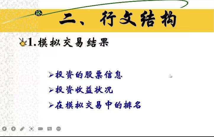 其次,行文结构方面的总结由模拟交易结果、宏观分析、行业分析、公司分析、财务分析、技术分析、投资评级和建议八个大部分和其中若干个小部分组成。例如基础面分析是对上市交易证券的基本情况进行分析,由此确定买哪只股票,技术面分析是依据股票过去的走势推测未来的发展方向,由此决定买入时点,也就是花多少钱去买等。
