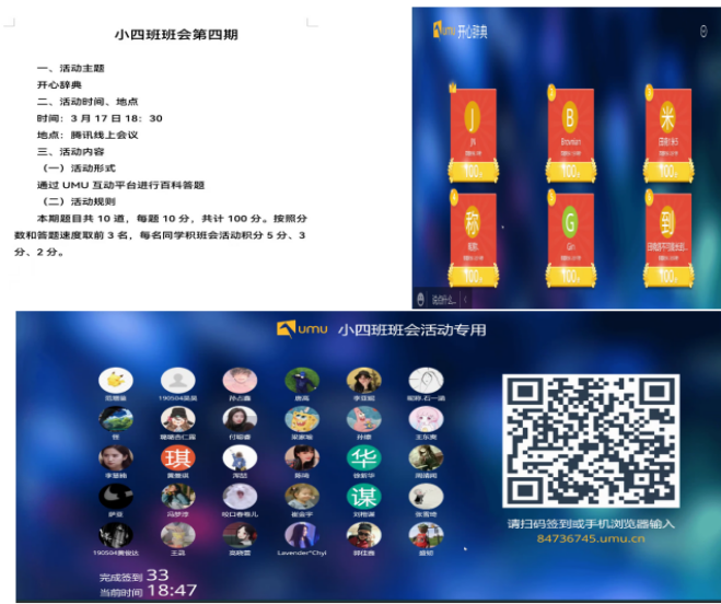 按照学校、学院党委关于疫情防控的统一部署建立联系学生制度的总体要求,自3月14日起开始,学院进一步配强班导师队伍,实现班级联系全覆盖,班导师每日开展班会,实现与学生线上面对面、点对点、一对一沟通,及时了解问题、发现问题、解决问题。自班导师工作制度实施以来,共收到学生反馈共性、个性问题100余项,全部问题都得到解决或解答,有效化解潜在矛盾和风险。同时开展线上成语接龙、文字推理、百科知识竞答、读书感受分享等第二课堂线上活动,充实学生课余生活,有效舒缓了学生封控时期的紧张情绪和压力。