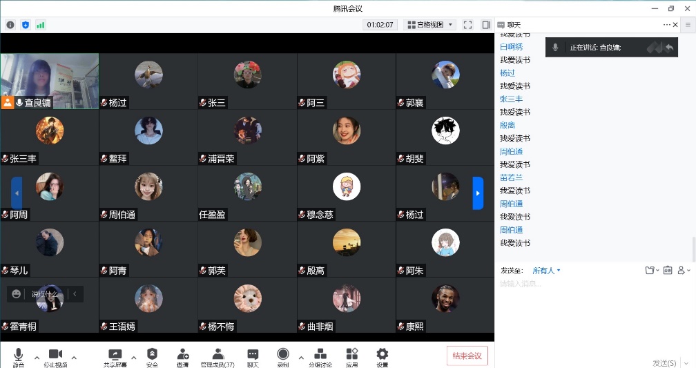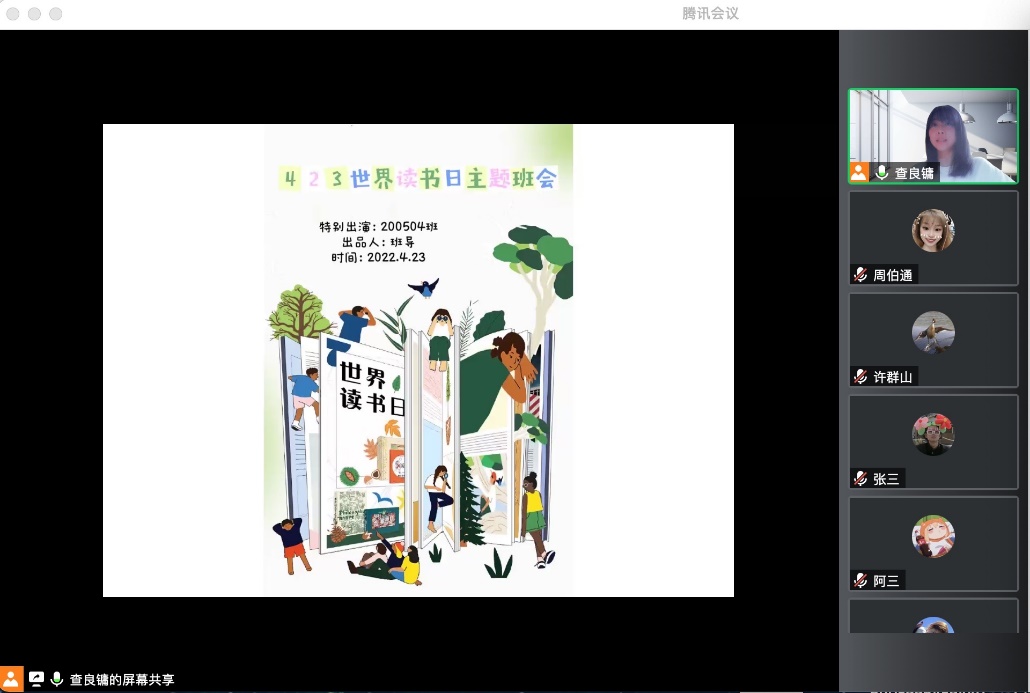 2022年4月23日是世界读书日,今天的北湖东校区阴天有雨落,但200504班的金融学子们心头暖意融融,经济系张博老师在腾讯会议举办了以“423世界读书日”为主题的班会,在这个抗击疫情的特别的春天,脚步无法丈量的地方,读书可以。