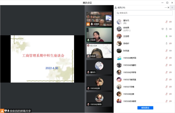 工商管理系在4月30日19:30—20:30线上召开了师生座谈会;系班子成员、教师代表和36名学生代表参加;徐俊昌副主任主持了本次座谈会;座谈会就师生在教学及生活中的问题和意见进行了充分的交流。