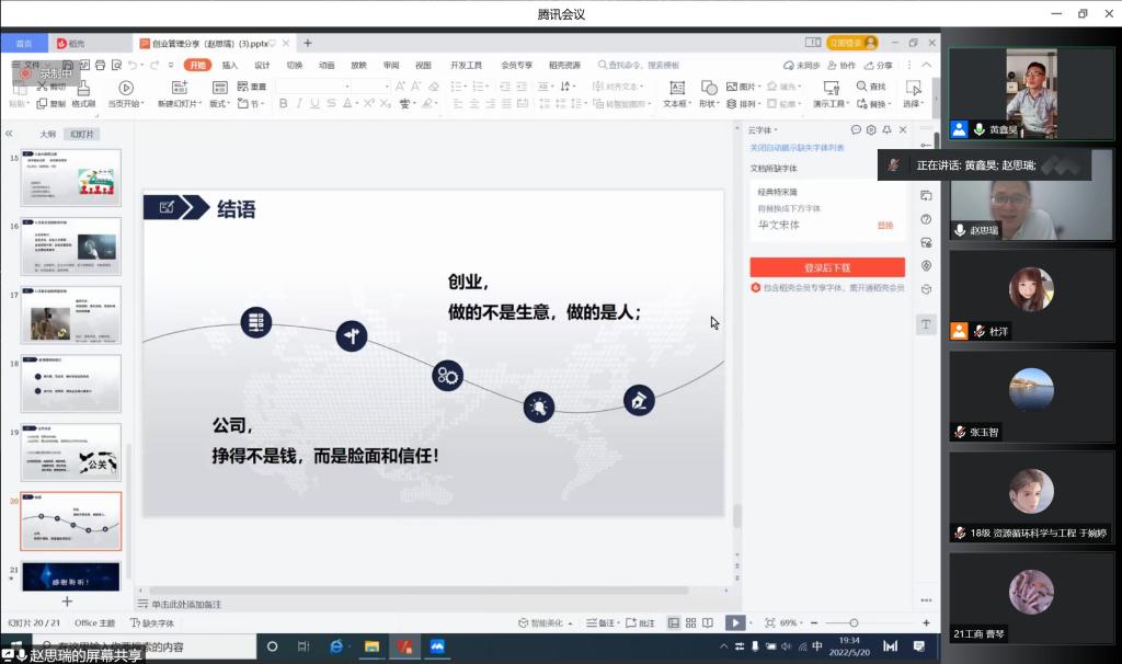 凝聚校友力量、传承经管文化、学习榜样精神、助力学子成才,2022年5月20日18:30,校友论坛2022年第3期在腾讯会议端举行,yl23455永利集团2018级MBA校友赵思瑞作了题为“创业管理实践”的报告。院长张玉智、部分教师、研究生及本科生参加了论坛。论坛由副院长黄鑫昊主持。