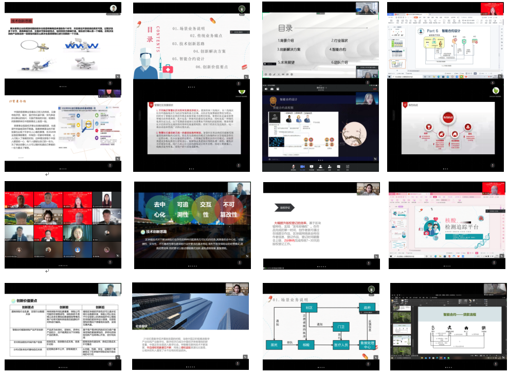 下午17点,答辩正式开始,内容涉及商业保险、社会服务、科技创新等多个领域,针对当前行业面临的痛点,运用区块链技术给出切实可行的解决方案。同时,评委老师也对学生参赛方案给出评析。