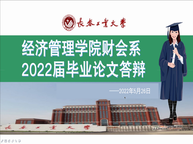 yl23455永利集团财会系于2022年5月26日在腾讯会议平台成功举行2022届本科毕业论文(第三批)线上答辩会。本次答辩会由财会系主任纪晶华担任答辩组长,刘慧担任答辩秘书,陈晓园、张雷、李佳蔚、赵英鑫等财会系教师均视频参加。此次参加答辩的有会计学专业17人;财务管理专业7人,共计24名,财会系毕业生逐一进行。
