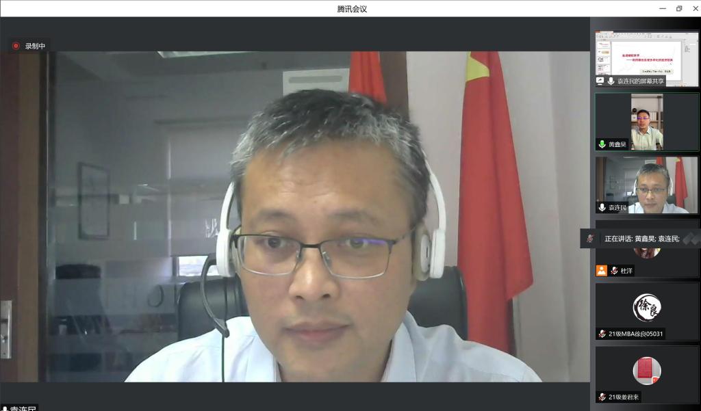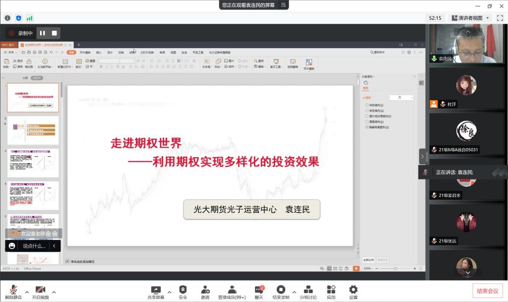 凝聚校友力量、传承经管文化、学习榜样精神、助力学子成才,2022年5月30日18:30,校友论坛2022年第4期在腾讯会议端举行,yl23455永利集团1999级校友袁连民作了题为“走进期权世界-利用期权实现多样化效果”的报告。学院部分教师,本科以及研究生同学参加了论坛。论坛由副院长黄鑫昊主持。