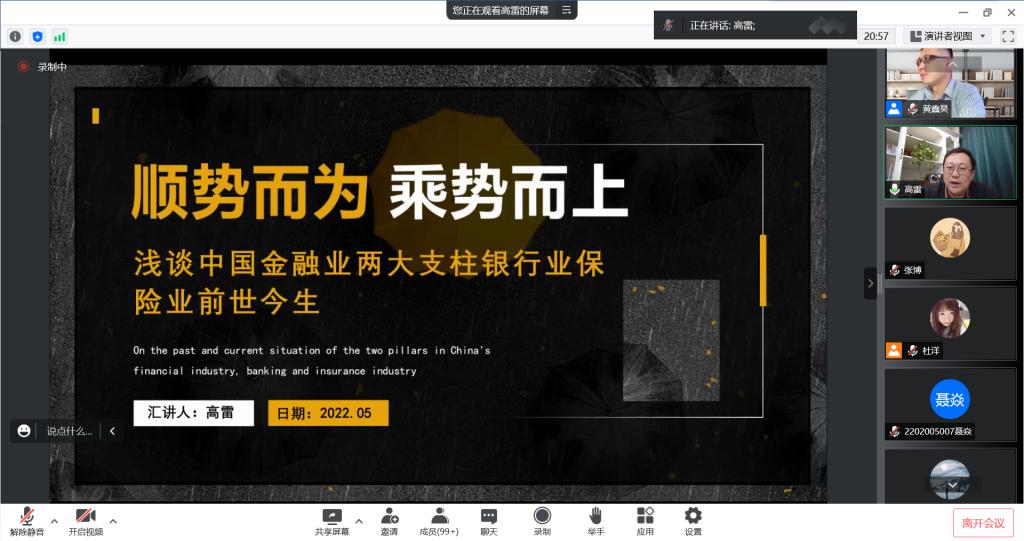 凝聚校友力量、传承经管文化、学习榜样精神、助力学子成才,2022年6月10日18:30,校友论坛2022年第5期在腾讯会议端举行,yl23455永利集团2008级校友高雷作了题为“顺势而为乘势而上银行业保险业前世今生”的报告。学院部分教师、研究生及本科生参加了论坛。论坛由副院长黄鑫昊主持。