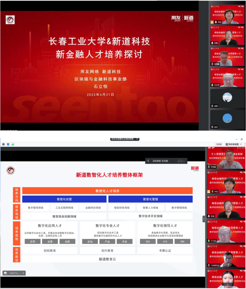 为推动数字经济时代的数智化改革,积极实践新技术、新产业、新业态、新经济模式下商科专业教育数智化升级和教学改革,进一步推进数字产业实践育人工作的开展,对接社会与区域的金融数字产业发展需求,经济系于2022年6月21日下午13:30,利用腾讯会议与新道科技股份有限公司联合召开永利官网&新道科技“链接金融科技 共育数智人才”研讨会。经济系张璇主任带领经济系部分教师积极参加此次研讨会,新道科技股份有限公司金融业务总监石立恒老师与参会教师就如何探索新金融人才培养进行了深入探讨。