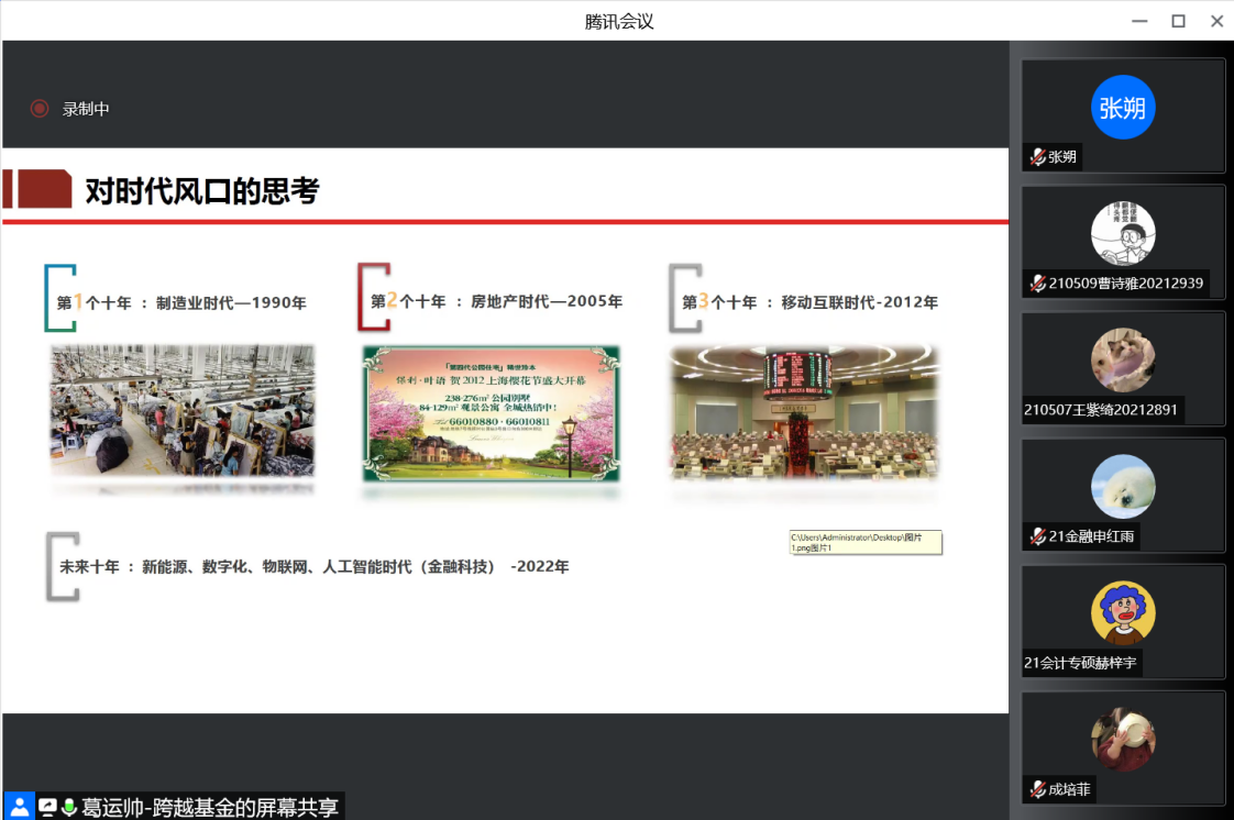 葛运帅校友结合自己的择业、就业和创业经历,为同学们做了一场有深度、有感悟又有专业的精彩报告。葛运帅的报告主要分为“人生思考”、“就业、择业和创业”、“投资”等三个方面。报告开篇葛运帅即向同学们提出了人生的3道题,指出人生最重要的能力是学习能力,一定要多阅读多思考多学习;随后对于“大学毕业后的择业与就业选择”、“大学毕业后是就业还是创业”等大学生毕业后即面对的问题讲述了选择标准和注意事项;通过分析“对时代格局的思考”、“对时代风口的思考”、“对新旧经济的思考”、“对共同富裕和橄榄型社会的思考”、“万物皆周期”等内容,葛运帅对“投资理解”和“投资的重要原则”提出了自己独到的见解。