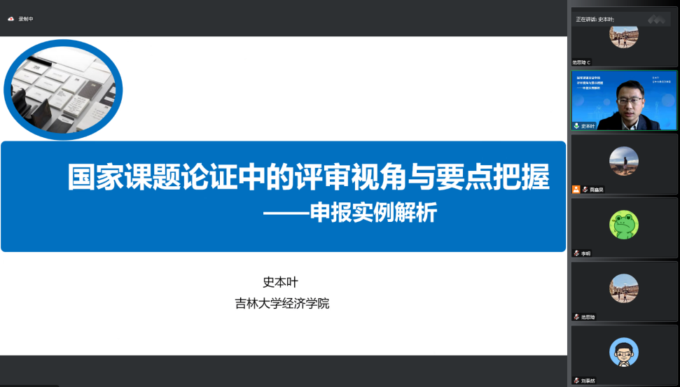 本次报告会主题为:国家课题论证中的评审视角与要点把握—申报实例解析。史本叶教授从是否申报、申报什么和怎么申报三个方面分享了国家课题的申报经验。史本叶教授重点分享了题目选定的经验,从优先布局的前沿领域、地方特色优势领域、历史类基础类题材和学科交叉领域阐述了选题的方向;从时代特征、问题导向、创新意识和可行可信等方面介绍了题目筛选原则;从“天时、地利、人和、史承”方面解析了选题的切入点,提出了“五年三遍和三年五遍”的选题方法。史本叶教授还针对国家课题申报书的写作要点与技巧进行了分享,结合自身经验分享了申报书中每个项目的申报要点和应规避的问题。讲座全程信息量充沛、知识点密集、语言生动、情真意切、干货满满。本次线上讲座有助于学院师生拓展学术视野、提高国家课题申报能力。与此同时,也加强了我院的学术交流,成功营造了良好的研学氛围。