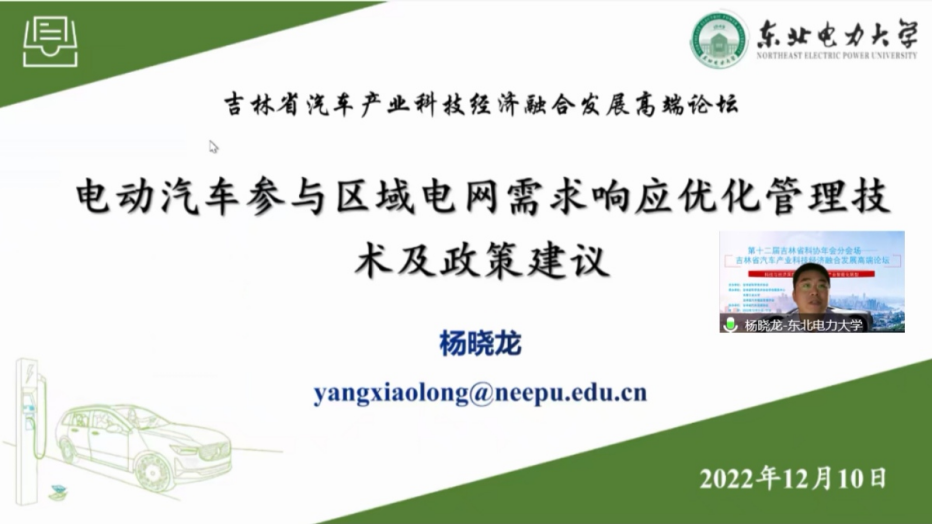 东北电力大学yl23455永利集团杨晓龙博士作题为《电动汽车参与区域电网需求响应优化管理技术及政策建议》的报告。
