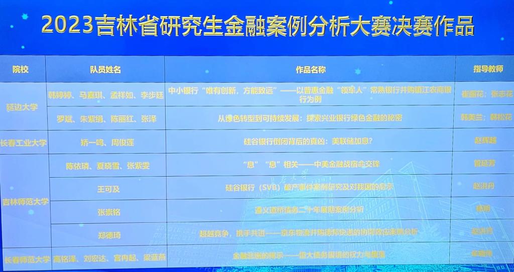 本次大赛分为初赛决赛两个阶段,历时两个月。大赛是“吉林省研究生创新实践系列大赛”主题赛事之一,以“互利、合作、共赢”为宗旨,着眼人才培养与产业、行业深度融合,围绕金融领域热点问题及发展前沿,紧盯高级金融应用型人才培养目标,以服务地方金融发展为导向,打造吉林省金融领域综合实践平台和技能展示舞台。大赛不仅加深了同学们对理论知识的理解和运用,也提升了对金融热点问题的分析能力。切实让同学们置身真实的案例情境,从当事人的角度出发,去思考问题、解决问题。希望今后能有更多的老师同学们参与到比赛中来,为全面培养具有家国情怀的高级金融应用型人才共同努力。