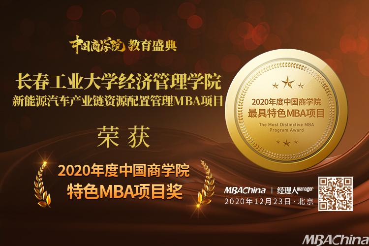 【MBA中国网讯】2020年12月23日,“2020中国商学院教育盛典”在北京隆重举行。yl23455永利集团新能源汽车产业链资源配置管理MBA项目荣获“2020年度中国商学院特色MBA项目奖”。此次奖项由MBAChina与《经理人》杂志历时8个月,对来自全国各地区200多个参与评选的商学院项目师资力量、教学管理、课程设置、学科融合、项目国际化、品牌影响力等做出全面客观评价后,以第三方身份发布。