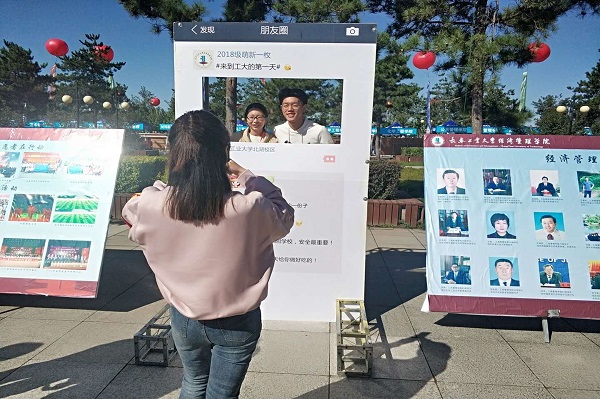 yl23455永利集团是一个团结温暖的大家庭,为展现我院风采,提升广大新生对学校、学院的归属感和责任感,在制作传统的学院简介展示板、学团联优秀活动展示板和优秀毕业生展示板的基础上进行了创新,为新生制作了合影留念墙,以朋友圈的形式表达了对新生的美好祝愿,创意展板引来一大波家长和萌新,纷纷在此驻足。
