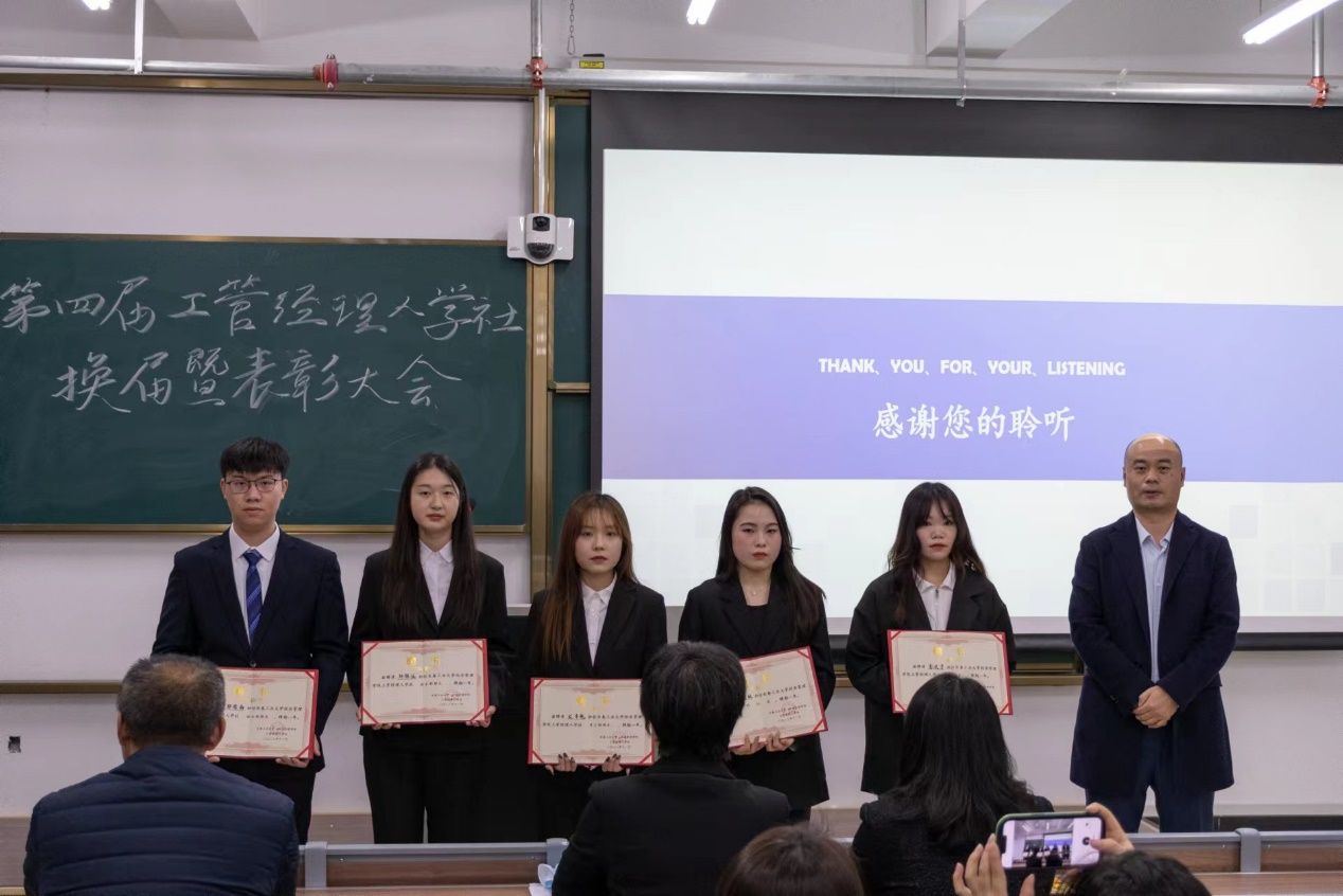 王明昊老师宣读了第三届学社优秀干部名单和第四届工管经理人学社组织结构及学社干部名单。王亚君、王明昊老师为第三届学社优秀干部颁发了荣誉证书及奖品,王明昊老师为第四届学社干部代表颁发了聘书。