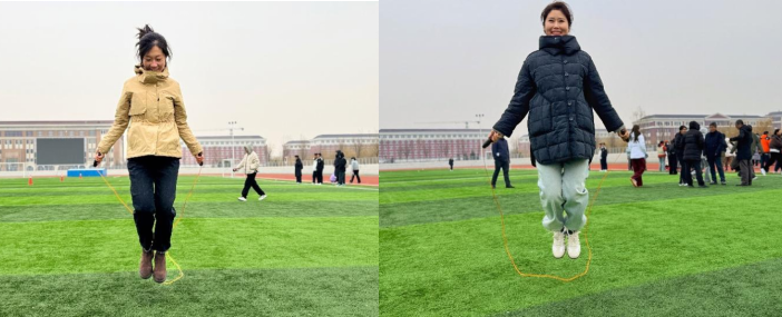 本次比赛创新采用“反向跳绳、双人跳绳”等形式,趣味十足,既考验协调能力,也需团队默契配合。赛场上,教师们精神饱满、配合默契,时而单人灵活跳跃,时而集体协同发力,加油声、欢笑声此起彼伏。“比赛很解压,和同事一起挥汗如雨,感觉特别放松,感情也更近了。”一位参赛教师笑着说道。